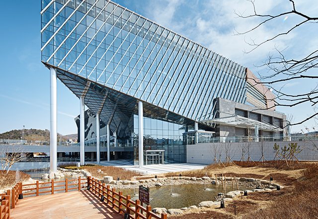 This building is a convention facility connected to the tourist infrastructure of Bomun Complex of Gyeongju, and reflects the high demands of a specialized exhibition facility, publicness and specialty. This modern building emphasizes the dynamic motive of leaping into a new millennium of Gyeongju, and metaphorically reflects the traditional patterns. The exterior space is extended out from linking it with surrounding spaces. It is designed to realize Green Convention of low energy consumptive facility by integrating with various eco-friendly elements and utilizing new regenerated energy.