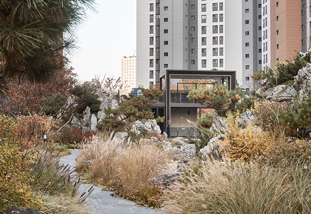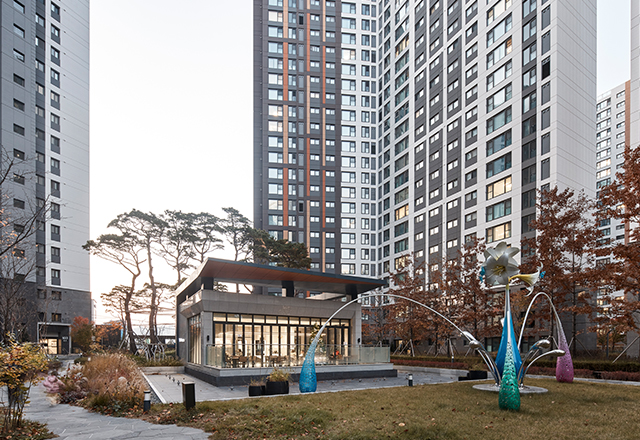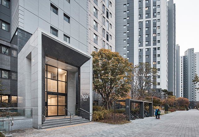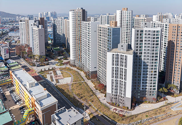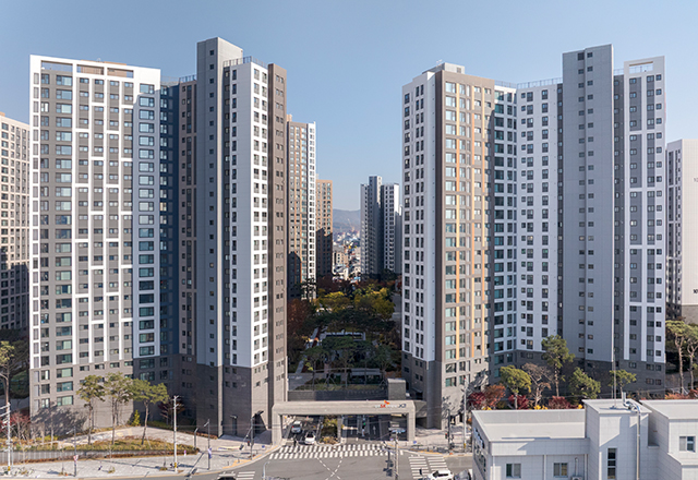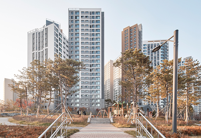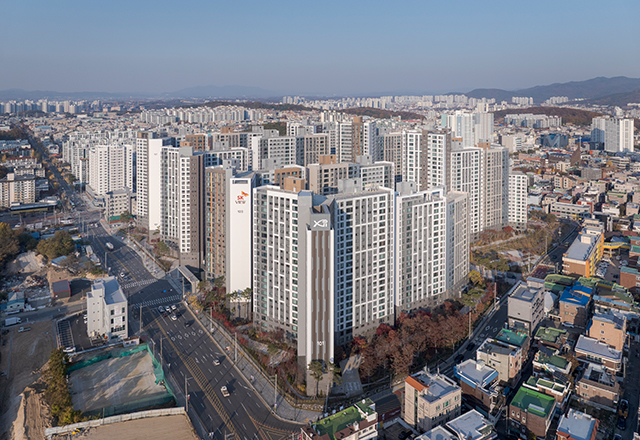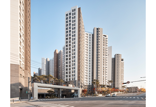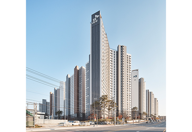 청주 SK VIEW 자이는 청주의 1세대 아파트로 자리해 온 봉명주공아파트를 재건축해 대단지 주거 단지로 재정비한 프로젝트이다. 판상형 4-BAY 단위세대를 최대한 적용하고 남향 위주로 배치함으로써 주거 환경을 개선하였다. 단지 사방으로 통경축을 확보해 개방감을 강화하고, 통풍 및 채광 여건을 개선하였다. 또한 대지의 지형 차이를 적극 활용한 데크 계획을 통해 다양한 외부 공간을 조성하였으며, 단지 동측의 근린공원과 연계해 외부 공간과 커뮤니티 시설을 체계적으로 배치함으로써 주민 이용 편의성과 커뮤니티 활성화를 극대화하였다.